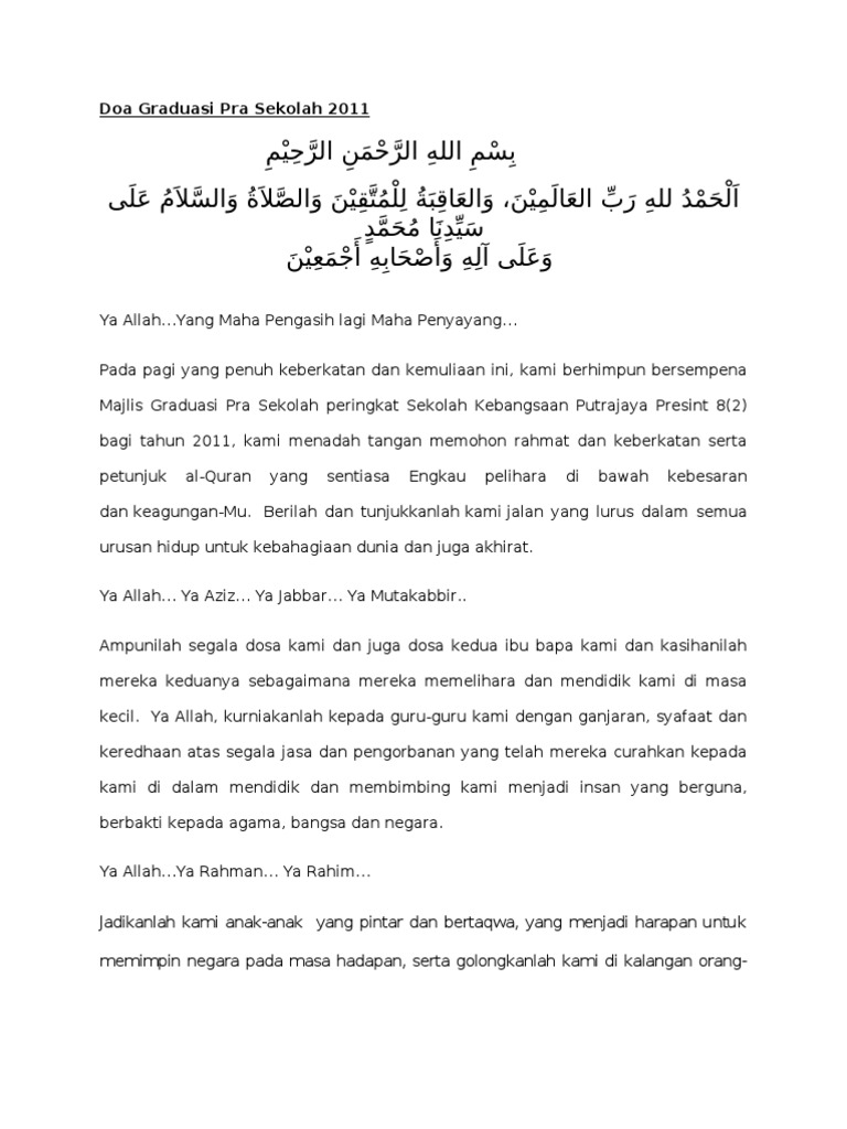 Teks doa majlis graduasi sekolah menengah. Marilah kita bersama-sama memanjatkan setinggi-tinggi kesyukuran ke hadrat Ilahi kerana dengan limpah kurnia dan izinNya dapat kita berhimpun dalam majlis yang bertujuan untuk memberi pengiktirafan kepada pelajar-pelajar menunjukkan kecemerlangan dalam Sijil Tinggi Persekolahan Malaysia pada tahun lepas. Seterusnya bagi melangsungkan majlis dengan segala hormatnya dijemput Tuan Zahid bin Omar Pengetua Sekolah Menengah Kebangsaan Sentosa untuk pengisytiharan graduasi. Samad yang dipertua persatuan ibu bapa dan guru sekolah menengah kebangsaan seri raub yang dihormati guru-guru penolong kanan guru-guru dan para ibu bapa yang diraikan para.
