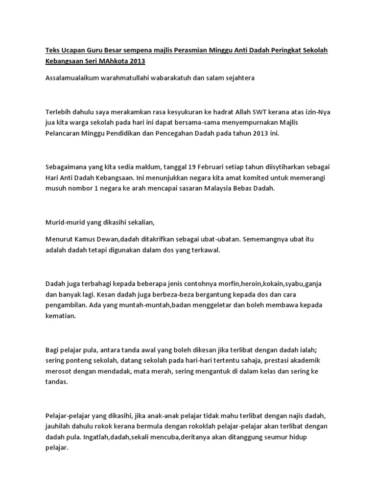Teks Ucapan Guru Besar Sempena Majlis Perasmian Minggu Anti Dadah Peringkat Sekolah Kebangsaan Seri Mahkota 2013 Pdf