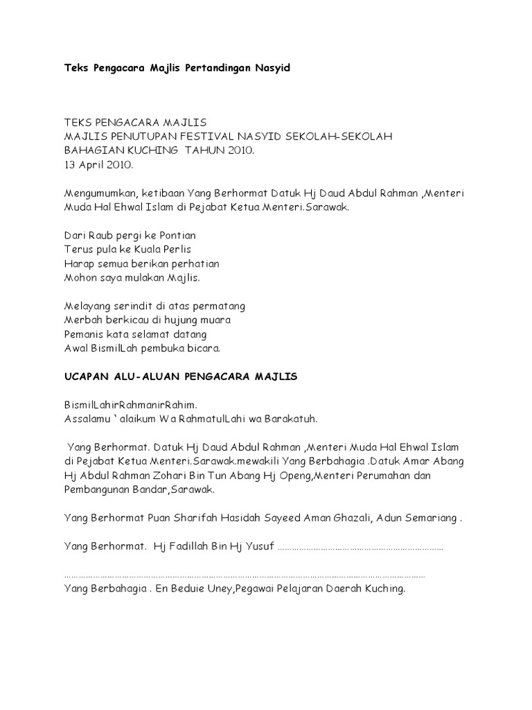 Teks pengacara majlis penutupan pertandingan nasyid. Pengurusan majlis rasmi yang telah berlangsung selama 2 hari. MULA MAJLIS Dari Raub pergi ke Pontian Terus pula ke Kuala Perlis Harap semua berikan perhatian Mohon saya mulakan Majlis. Mengumumkan ketibaan Yang Berhormat Datuk Hj Daud Abdul Rahman Menteri Muda Hal Ehwal Islam di Pejabat Ketua MenteriSarawak.