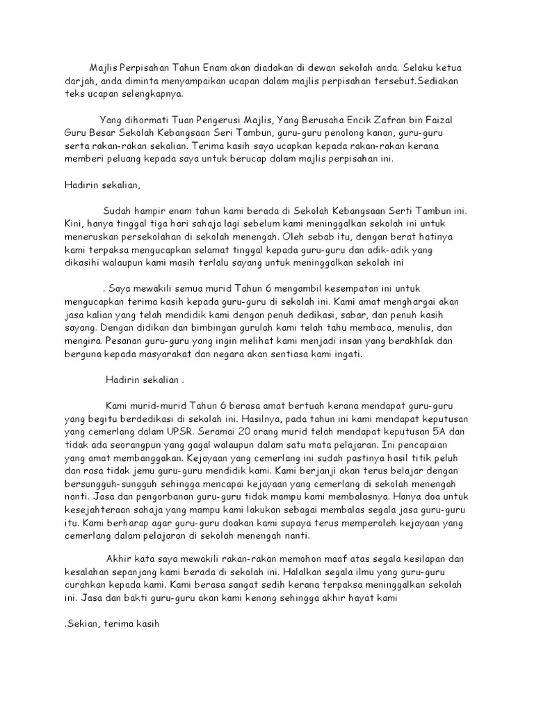 Anak tanjung anak mami Pandao masak nasi dan laksa. Ucapan dibuat untuk majlis perasmian perpisahan meraikan seseorang atau mengingati hari tertentu. Mulakan karangan ucapan dengan kata-kata alu-aluan dan mengakhirinya dengan ucapan penutup.
