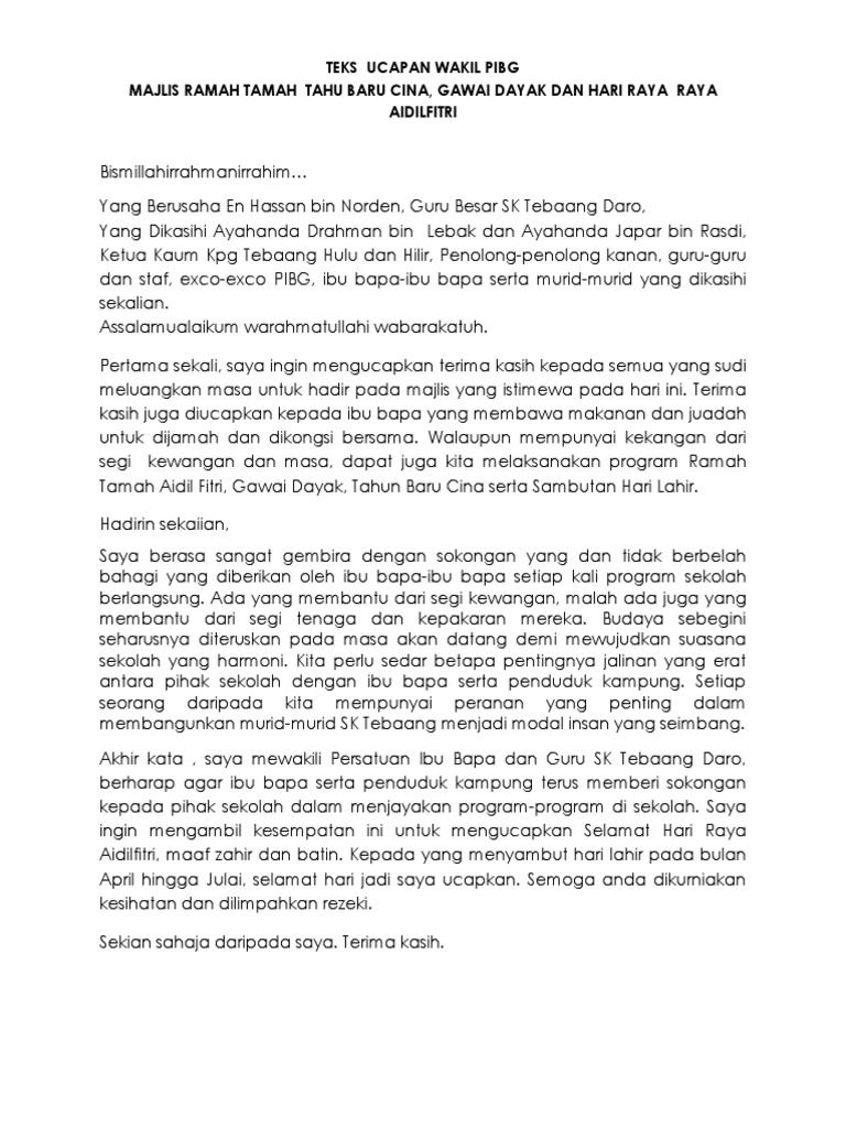 Teks ucapan majlis sambutan hari raya aidilfitri. Teks Mc Sempena Majlis Hari Raya Aidilfitri 2013 Cute766. Salam Sejahtera Salam 1Malaysia dan Salam Perpaduan. Seterusnya majlis sekali lagi mempersilakan tuan pengetua penolong kanan pentadbiran penolong kanan hem dan penolong kanan kokurilulum untuk memotong lemang di hadapan pentas sebagai simbolik perasmian acara sambutan hari raya pada tahun ini.
