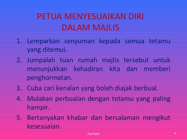 Majlis yang tidak banyak mematuhi protokol seperti majlis jamuan teh sempena Hari Kebangsaan. Adab perlu dijaga agar ilmu yang didapatkan bisa bermanfaat bagi kehidupan dan meninggalkan perbuatan sia-sia. Im going to introduce.