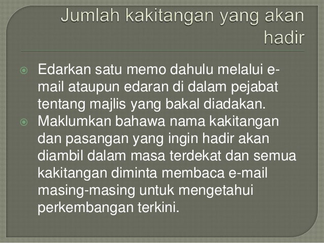 Buat pemeriksaan audio visual sebelum majlis Kemudahan Logistik Sediakan senarai keperluan logistik Papan penunjuk arah Pengiring keselamatan Tempat meletak kereta Tempahan kenderaan Peralatan menandatangani meja alas meja pen blotter dulang cenderamata Hiasan Backdrop Hantar surat borang permohonan keperluan logistik kepada pihak yang berkaitan Pastikan keperluan telah diterima dan berada dalam keadaan baik untuk. 25 APRIL 2014 e Tempat HOTEL BANGI-PUTRAJAYA f Jumlah Peserta.