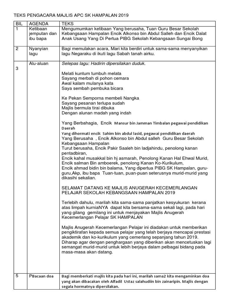 TEKS PENGACARA MAJLIS HARI ANUGERAH KECEMERLANGAN. Roslan bin zainal abidin kerana sudi hadir dalam majlis anugerah kecemerlangan smk cheras jaya pada tahun ini. Pelajar diminta memberi kerjasama sepenuhnya sepanjang program berlangsung.