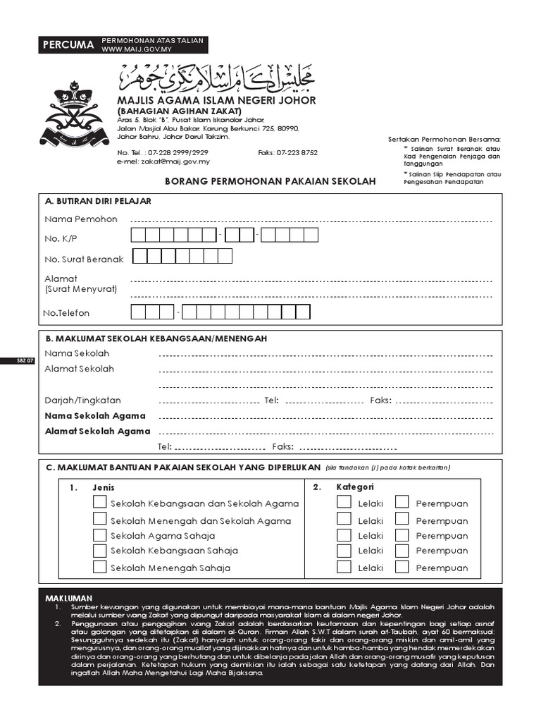 Majlis Agama Islam Johor MAIJ telah membuka permohonan bagi pelajar yang akan memasuki Institusi Pengajian Tinggi IPT dalam negara menerusi Skim Bantuan Zakat Pendaftaran IPT. Sekolah agama negeri johor segamat sekolah agama negeri johor tangkak kembali. Pdf 06 Borang Zakat Pelajaran Ayie Khairie Academia Edu.