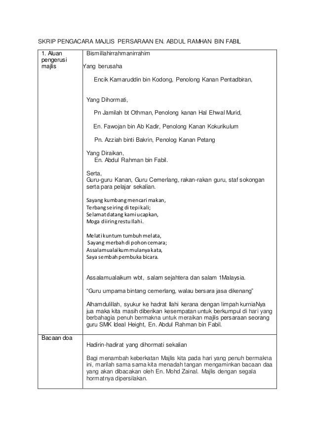 Skrip Pengacaraan Majlis Anugerah Cemerlang 2015 Terima kasih kepada SK JIJAN atas perkongsian sebelum ini menjadikan panduan dalam menyiapkan teks pengerusi Slideshare uses cookies to improve functionality and performance and to provide you with relevant advertising. Tiba masa menjamu selera. Dan teks ini sha rujuk dari Contoh Teks MC.