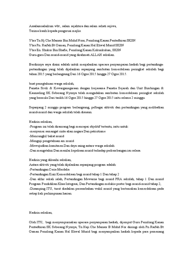 Juga sesuai diubahsuai untuk program sambutan lain dan juga peringkat daerah serta kebangsaan. Ucapan pihak majlis mengucapkan ribuan terima kasih kepada yang dihormati en kamsano bin padikon atas ucapan itu tadi. Contoh teks terbaik dan lengkap dari mula program sehingga akhir penutup.